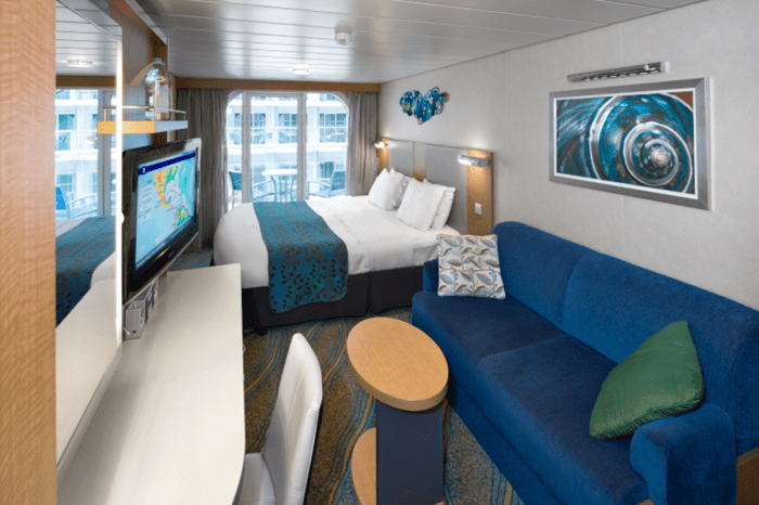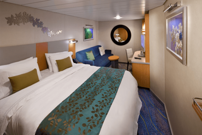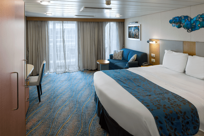 Two twin beds that convert to a Royal King, private bathroom, sitting area, and flat-screen TV. These larger interior cabins are well-appointed and offer everything you need for a comfortable voyage.