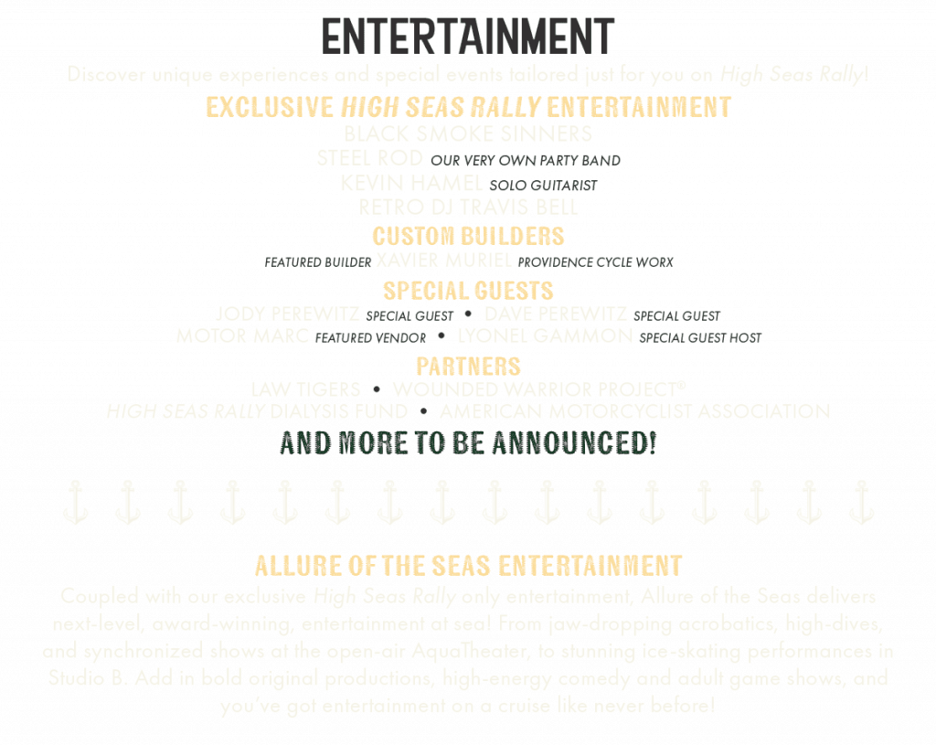- Concerts, parties, & games while connecting with fellow bikers as we sail to stunning destinations