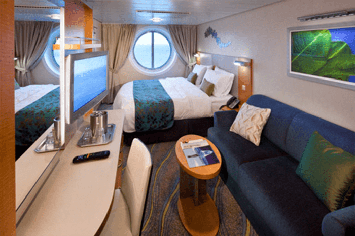 Two twin beds that convert to a Royal King, private bathroom, sitting area, and flat-screen TV. Enjoy a window with ever-changing views of the sea and scenic ports.