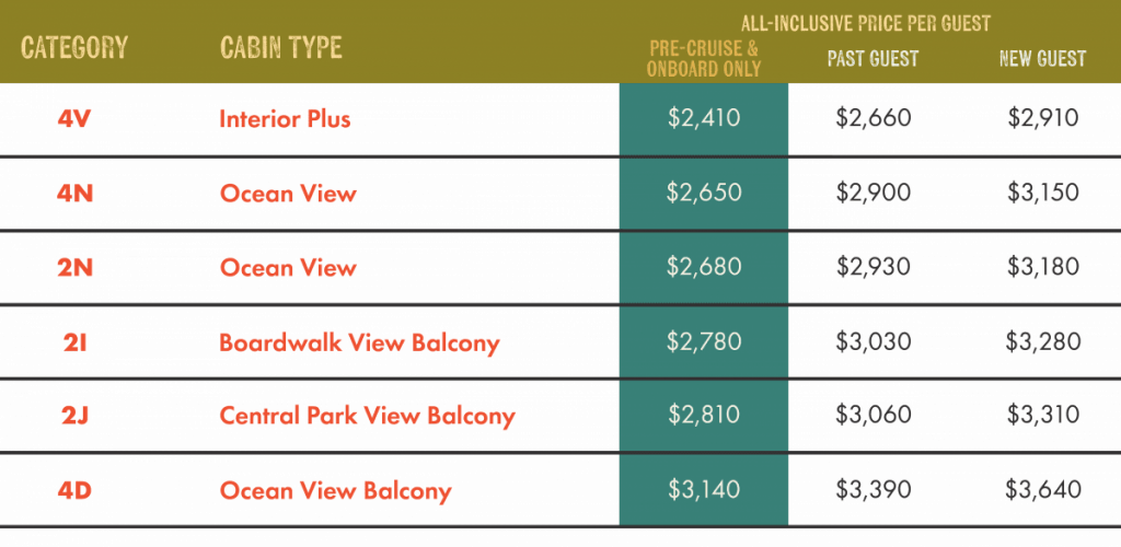 Prices are per person, based on double occupancy, and include all performances, parties and events presented on the cruise. Port fees, taxes and gratuities are included in your total reservation cost. Other terms and conditions apply.